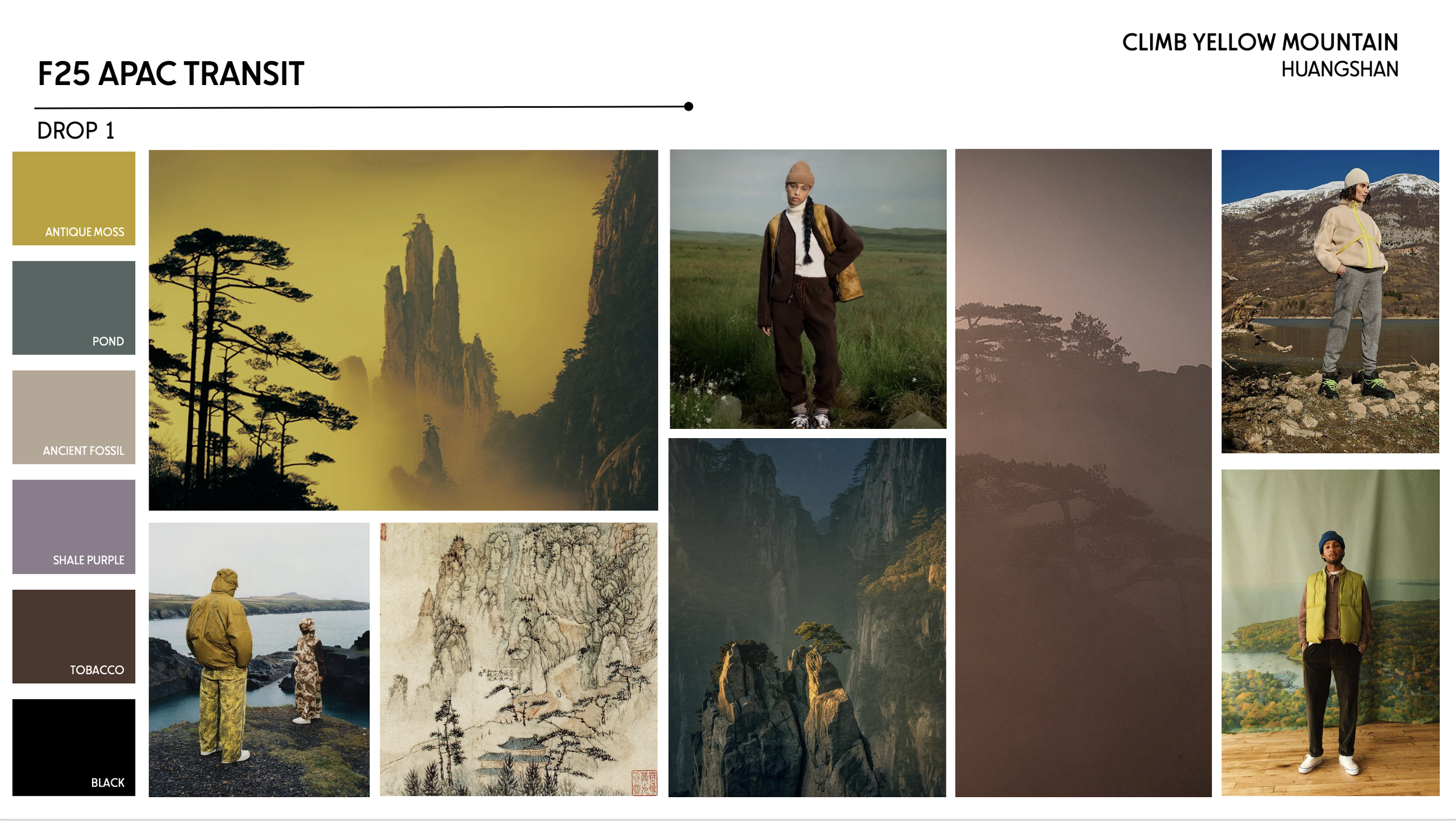 Flow one was inspired by Yellow Mountain in Huangshan, China, showcasing earthy neutrals, accented by Antique Moss.