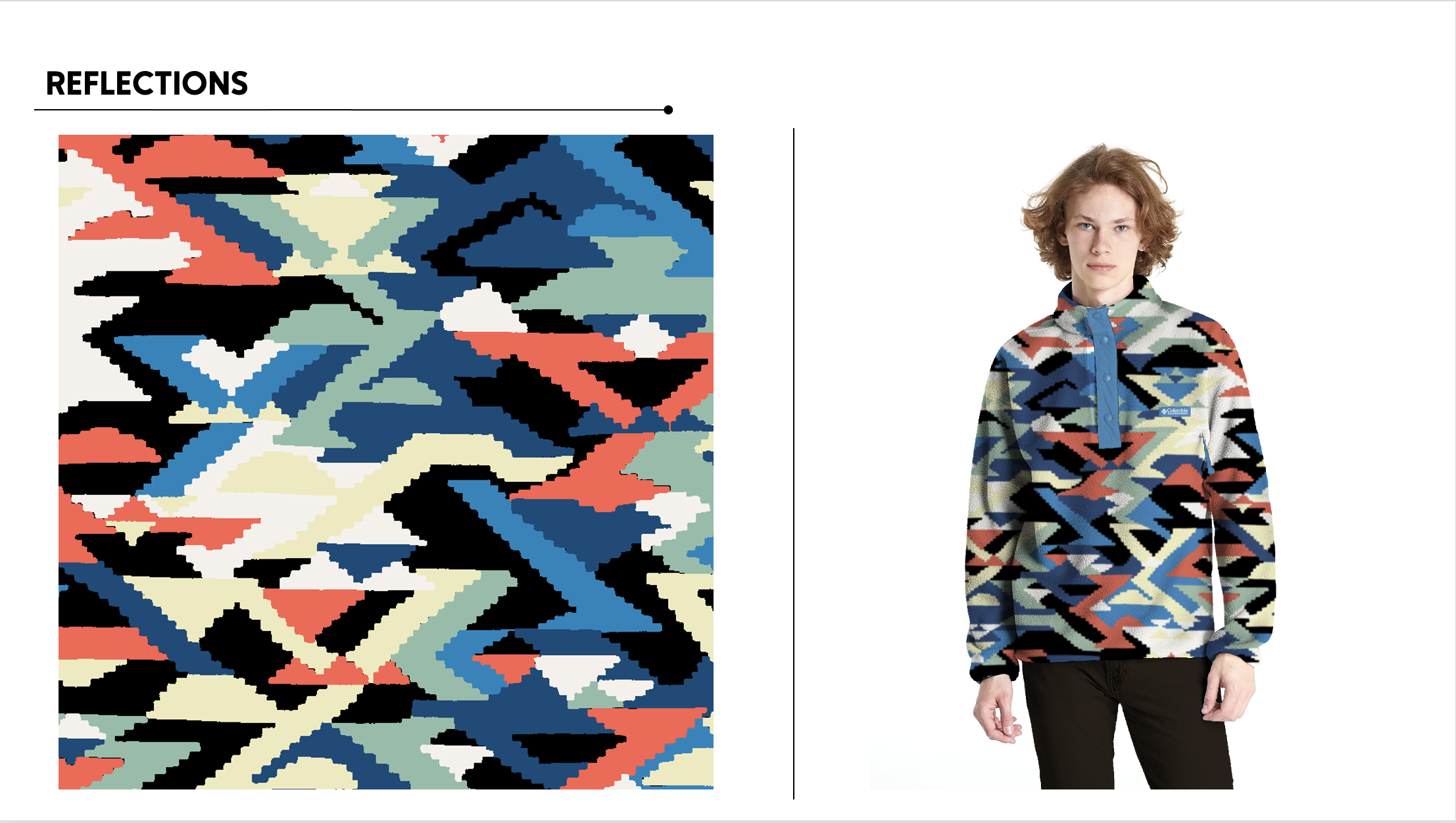 I also art directed the print for the F25 Icons collection — a large scale, macro geometric print that references the jagged peaks of Broken Top, and irregular pools of color, resembling the lake’s water. We loved the idea of bringing a geometric print back into icons as a bold statement, and because of their iconic place in Columbia’s product’s history.