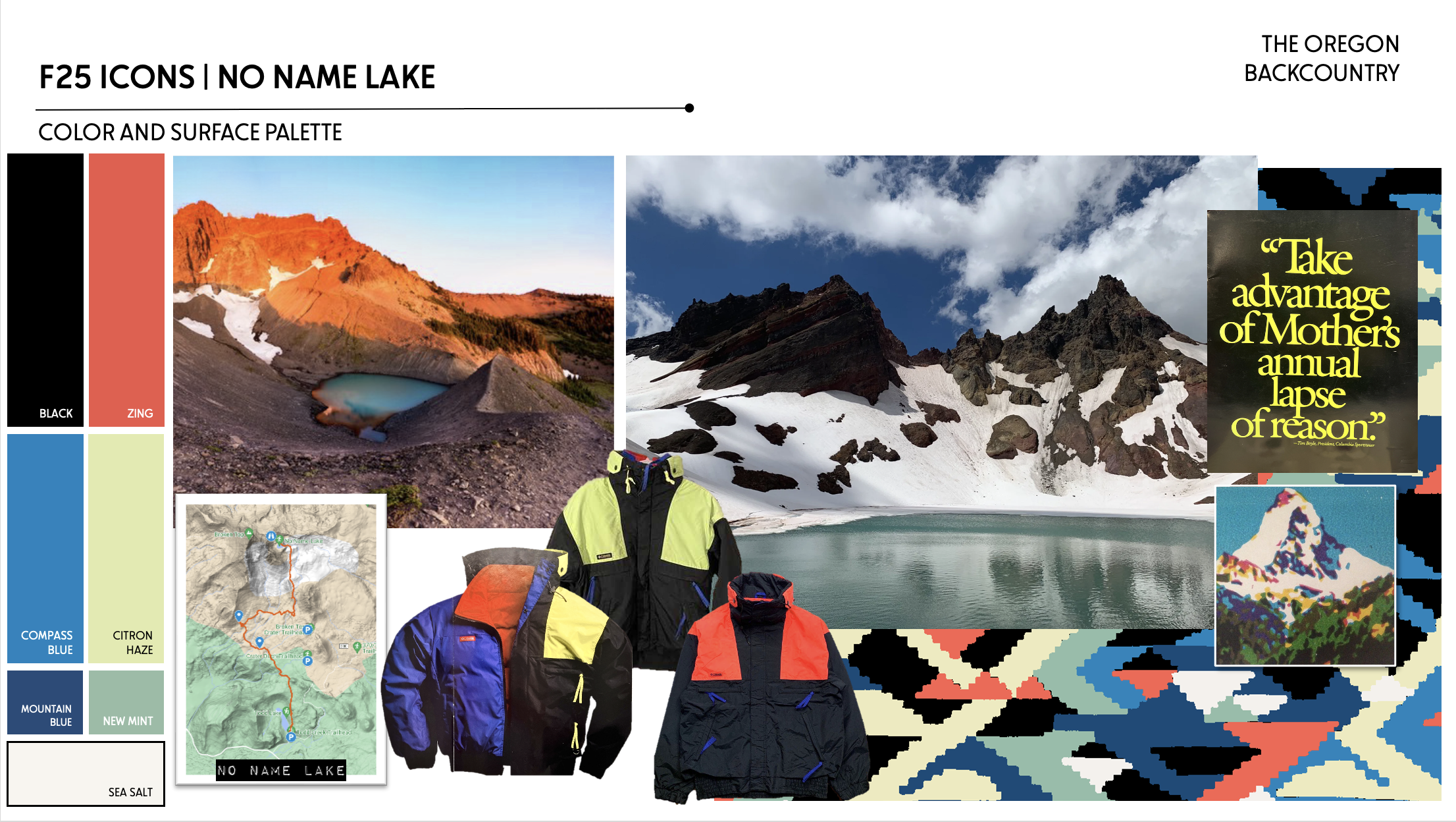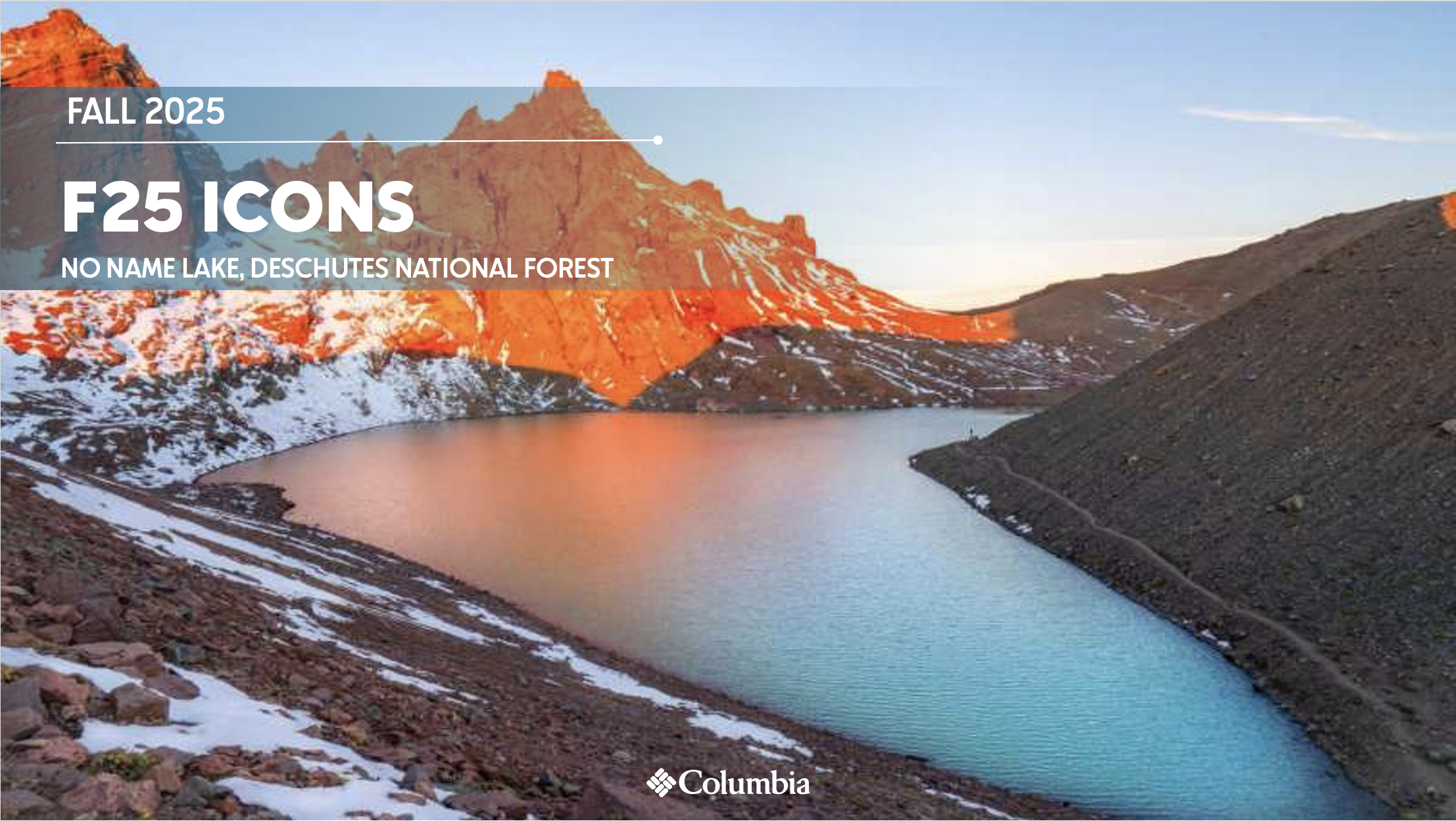 For Fall 25 the inspiration location for the greater design team was the Deschutes National Forest. At the beginning of the season, some of our design team had the opportunity to travel to Odell Lake to get inspiration and wear test some product on location. Just a few hours north, sitting atop Broken Top Mountain in the Three Sisters Wilderness, is No Name Lake, which was the inspiration for the F25 Icons collection.