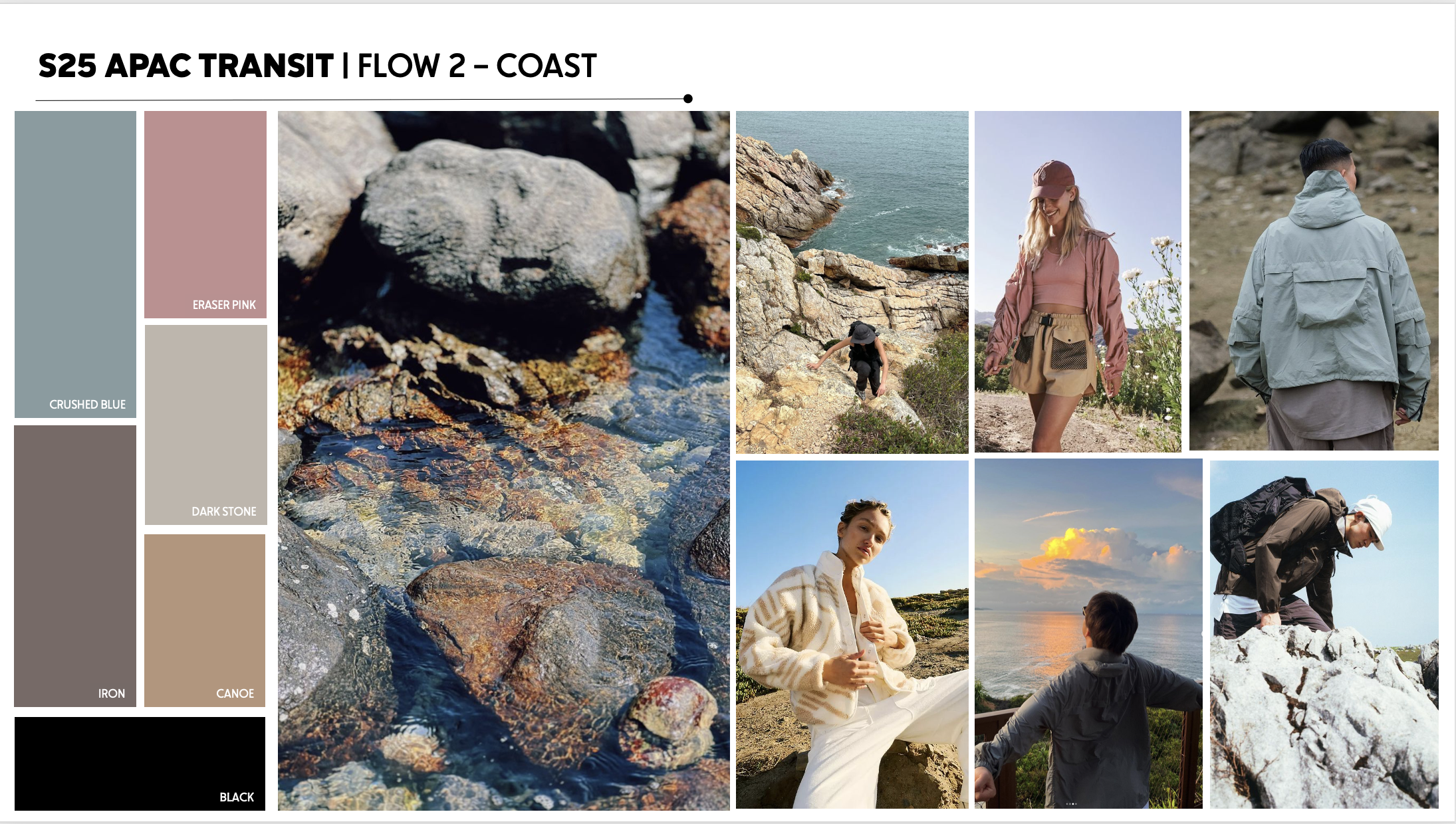 Flow 2 was inspired by Coastal Hikes in China. Here the palette shifts a bit lighter and softer with River Blue softening to Crushed Blue, and the addition of Eraser Pink; with the neutrals as the link between the flows.