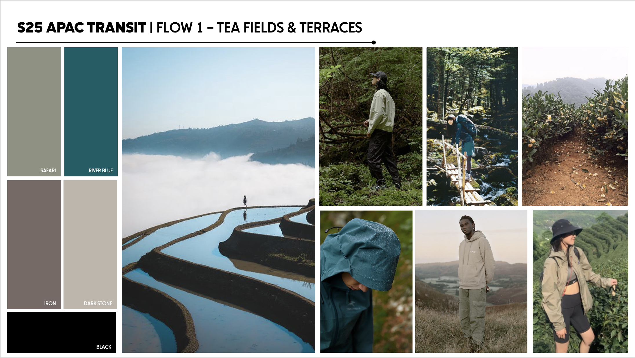 Flow one was inspired by tea fields and terraces, leaning into a seasonal teal, River Blue, and foundational green, Safari; grounded by rich browns.